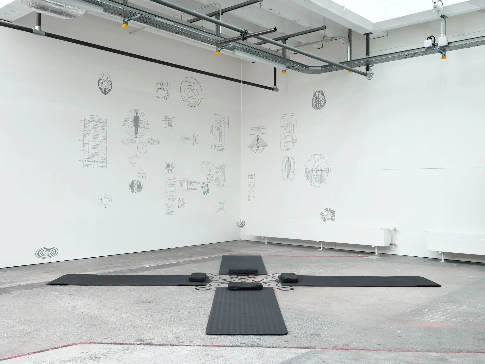 The installation consisted of silver vinyl diagrams on the wall, four mats and head cushions, black floor vinyl, and a miniature hanging mandlebulb 3D printed in resin and painted silver. For the interactive performance, the miniature mandlebulb was replaced with the full-size mandlebulb, which contained a flicker light lamp that was used during the performance.